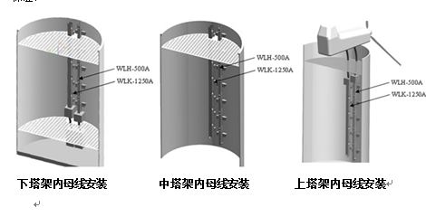 安裝前每段母線單元需進行絕緣性能現(xiàn)場檢測,絕緣電阻≥20MΩ;同時檢查電纜轉接箱內(nèi)母線槽始端接頭連接的可靠性,重點檢查母線接頭螺栓的緊固性;安裝過程參照塔架內(nèi)母線槽布置總圖(見附圖)。 母線槽現(xiàn)場安裝與塔架吊裝同時進行,具體步驟如下: 1)按風電塔架(通常為三段:下塔架、中塔架、上塔架)的吊裝順序,分別將母線槽在塔架內(nèi)先行安裝好,注意應保證母線槽在塔架法蘭處的預留定位尺寸(見總圖要求),以滿足后續(xù)塔架內(nèi)母線的安裝(此處將由我方工程技術人員現(xiàn)場指導,重點控制保證); 2)各塔架內(nèi)的母線槽安裝位置需沿著統(tǒng)一軸線進行,以滿足塔架間連接的共軸性,該軸線需在安裝前在塔架上統(tǒng)一設置相應標記進行標注,安裝時可拉線指導(此點將由我方工程技術人員現(xiàn)場指導,重點控制保證); 3)每段塔架內(nèi)母線槽安裝完成后,需復測該段的絕緣電阻,確保符合產(chǎn)品標準要求; 4)將各塔架內(nèi)母線槽設備與塔架同時吊裝,由下至上依次吊裝就位并緊固安裝好塔架; 5)當三段塔架均已安裝就位后,將塔架間預留安裝填充段母線槽,填人空隙,通過快速連接器安裝就位; 6)完成塔架內(nèi)母線槽全段的安裝后,再次復測整段母線槽的絕緣電阻,并進行耐壓測試以確保符合產(chǎn)品標準; 7)現(xiàn)場將上下兩端預支電纜壓接好接頭(注意接頭規(guī)格需與電纜轉接箱內(nèi)導體預留孔尺寸配合)并與電纜轉接箱連接緊固好,從而完成該線路母線槽的全部安裝工作。